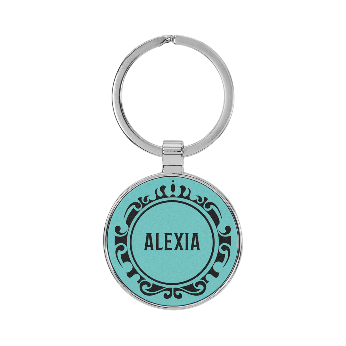1 1/2" Laserable Leatherette/Metal Teal Round Keychain